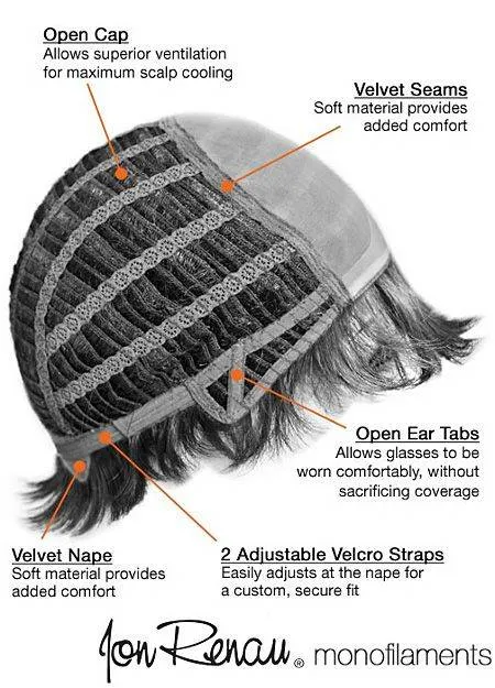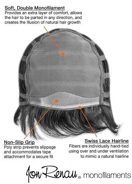 Верх парика изготовлена с применением Monofilament'а, который имитирует кожу головы. В результате чего закрепленные на парике волосы внешне соответствуют натуральному росту волос.