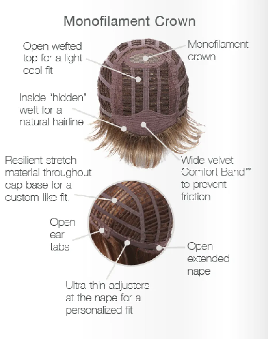 Для того, чтобы ни у кого не возникло сомнения в том, что данная прическа — не парик, а ваша настоящая стрижка, чтобы вы могли не бояться раскрытия своего секрета, макушка парика сделана с использованием монофиламента — материала, который максимально имитирует кожу головы и натуральный рост волос.