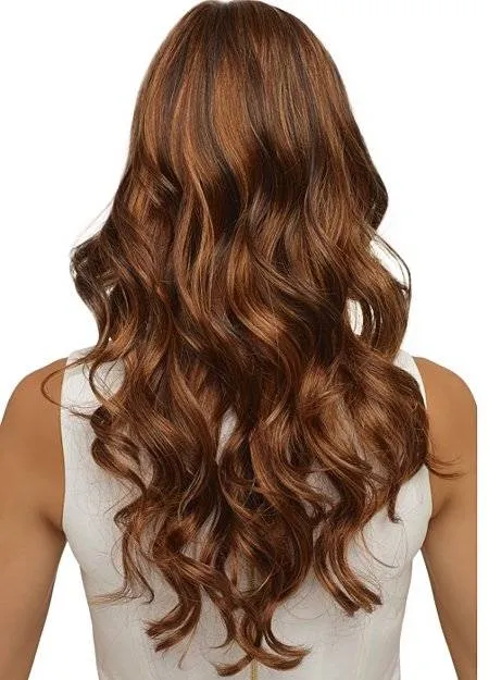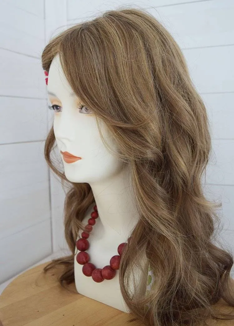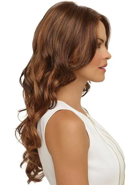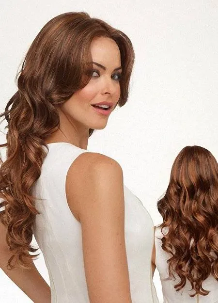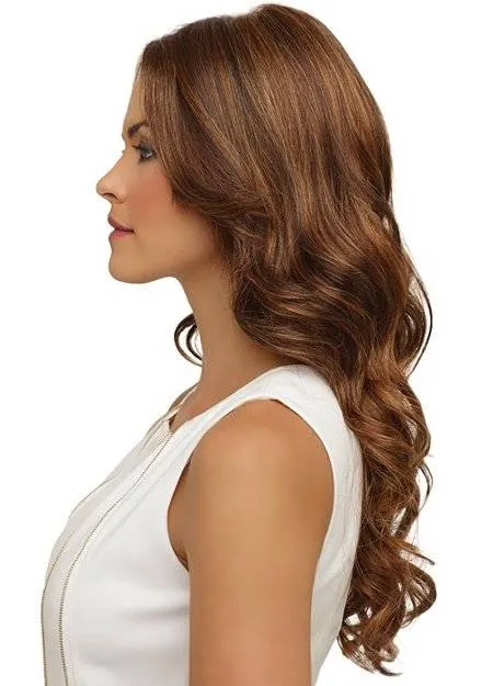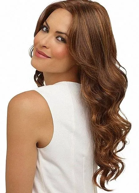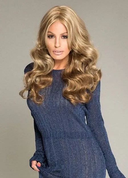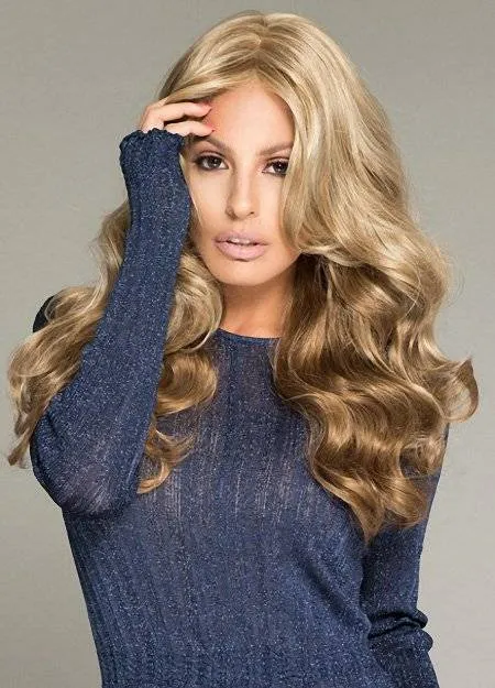Удлиненные многослойные волосы парика Brianna элегантно смотрятся в сочетании с волнистой челкой. Верхняя прямая часть волос незаметно переходит в локоны, придавая прическе особый шарм и женственность